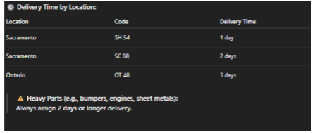 d. For other locations or heavy parts, set delivery to 2+ days.